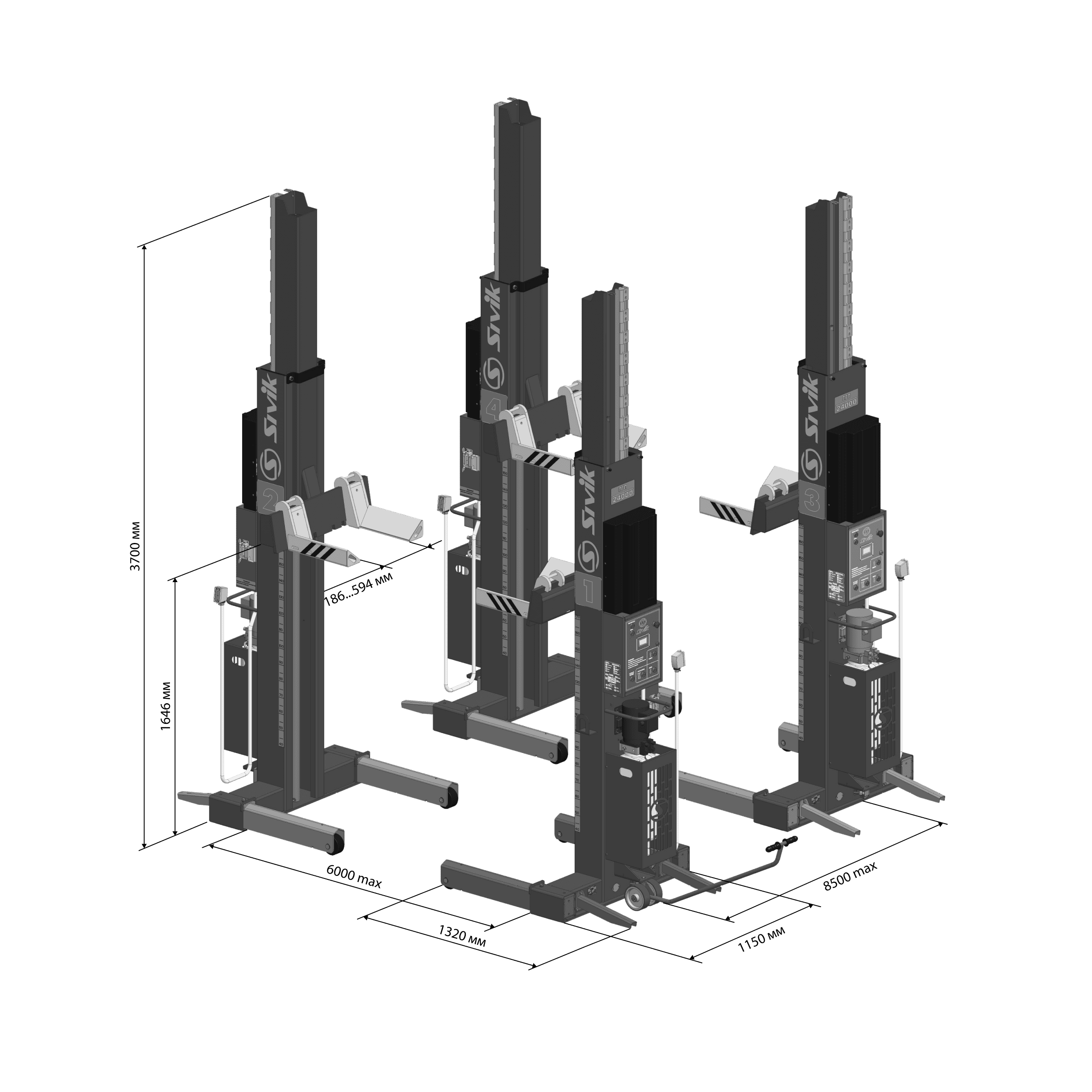 • Подъемник из 4 колонн с помощью комплекта дополнительных стоек можно нарастить до 6 колонн